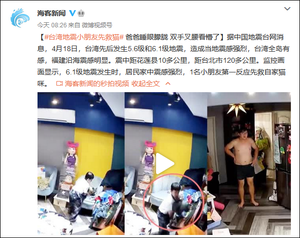 台灣花蓮連發兩次地震,島內一小朋友第一時間救貓逃生_風聞