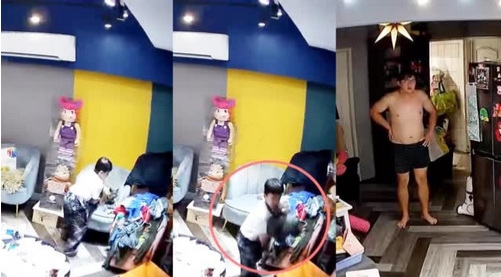 從監控畫面可見,在小男孩第一時間抱起貓咪跑走後,下一秒,光着膀子,穿着短褲的老父親便手扶眼鏡,匆忙走出房間。