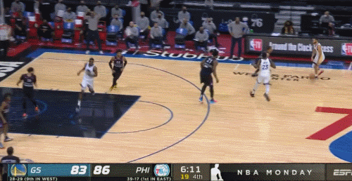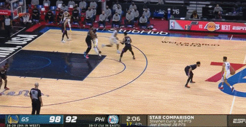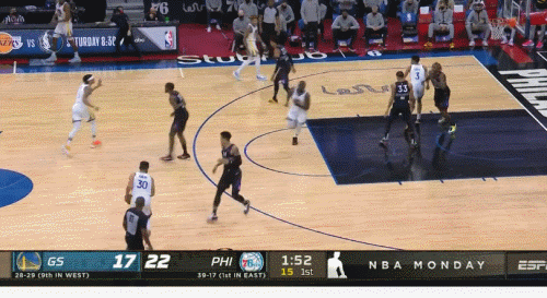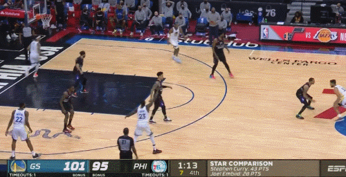 迫使庫裏把球交給隊友,這是76人需要達到的目的,打無球,可能是庫裏最舒服、省力的方式,可這並不是勇士的勝利方程式。只有在持球狀態下,庫裏的個人進攻才能以無損的方式徹底宣泄,在庫裏本場命中的10個三分裏,只有一個是接球投籃,剩餘9個全是持球后快速出手。