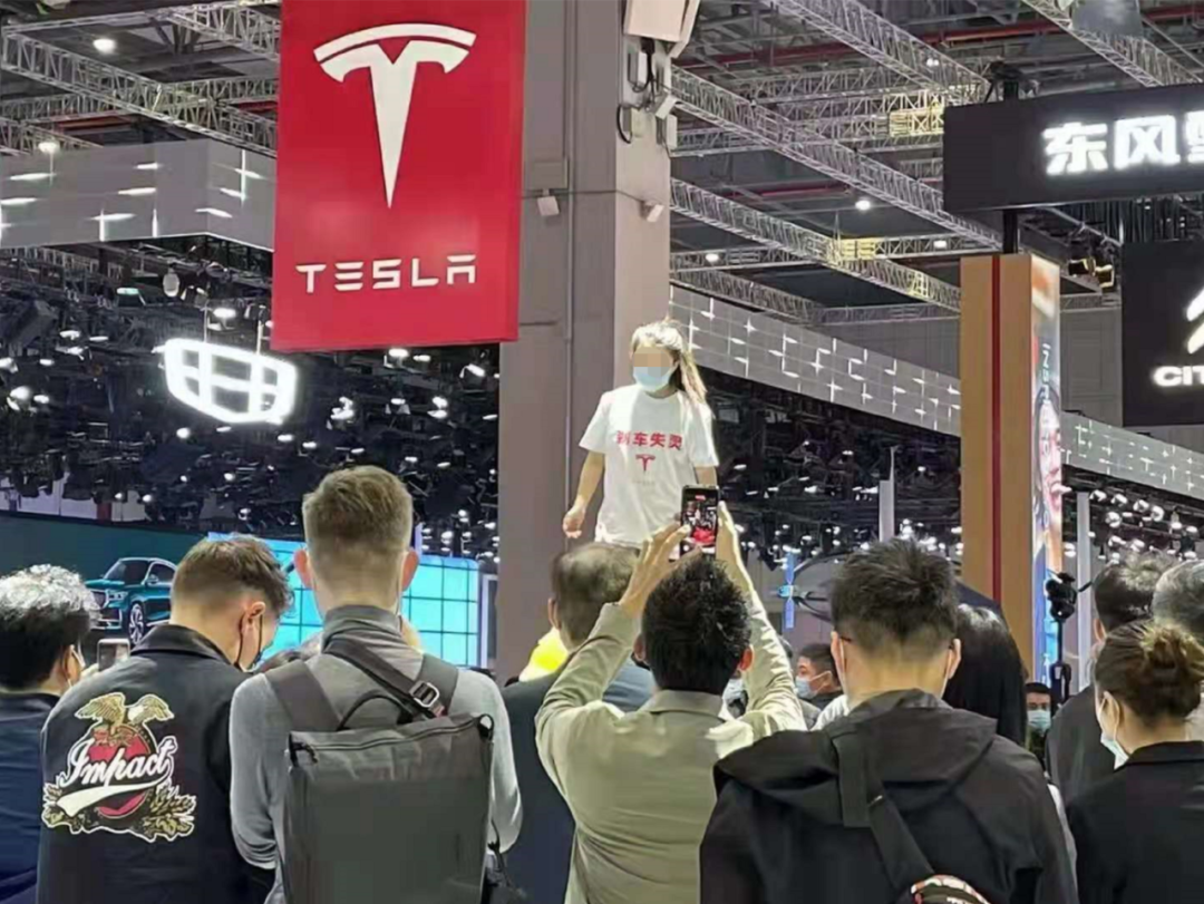 現場視頻顯示,一位特斯拉年輕女車主身穿印有“剎車失靈”字樣的T恤,站在車頂不停高喊“特斯拉剎車失靈”。旁邊,一位身着同樣T恤的女車主,也一邊揮手,一邊大喊“特斯拉剎車失靈”。背景聲中,還有個男聲在説“應該給中國消費者一個交代吧。”