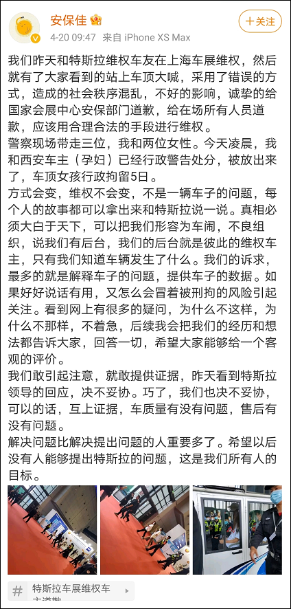 對於特斯拉接二連三的表態,參與19日車展維權的一位當事車主@安保佳 於今日通過微博發聲。