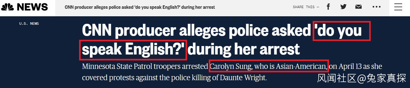 NBC: 據給明尼蘇達州州長的一封信説,美國有線電視新聞網(CNN)的一名製片人正在報道抗議警察殺害達特·賴特(Daunte Wright)的抗議活動,並被一名警官逮捕並詢問她是否會説英語。