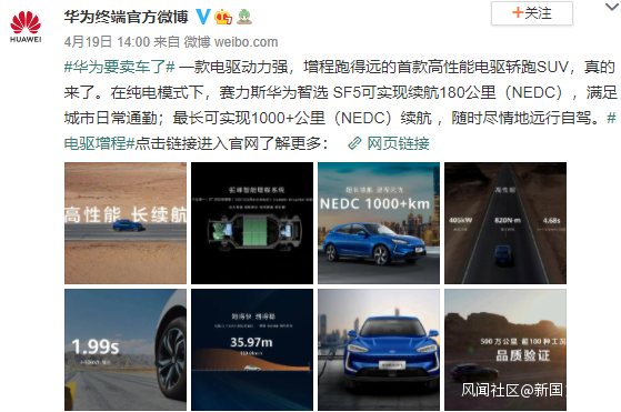 華為正式開啓汽車售賣業務,首款車型為賽力斯華為智選SF5,目前該車已經上線華為消費者官網,21日起,用户可到全國的華為旗艦店體驗。