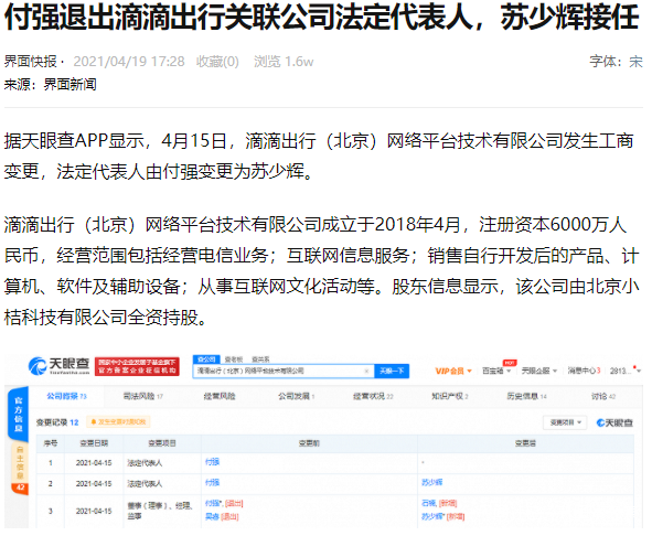 付強退出滴滴出行關聯公司法定代表人,蘇少輝接任。