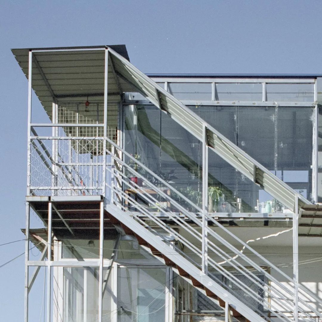 大家再看這個房子,注意一下它的每一層,它們表面材料是不一樣的,這暗示了其實它經過了兩輪的加建。這三層是三個不同的時期蓋出來的,尤其是頂上第三層的部分,整個在原來二層之上拿鋼結構重新搭的,再通過一個鋼樓梯把每一層串聯了起來。