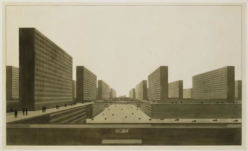 接下來我給大家講一下板樓大概是怎麼來的。其實早在一百年前,歐洲現代主義早期的建築師,在一系列未來城市的構想中就描繪過這種大板樓。大家看一下1924年的這張圖,這是一位德國建築師,叫路德維希·希爾貝塞默,他著名的垂直城市中的一副插圖——