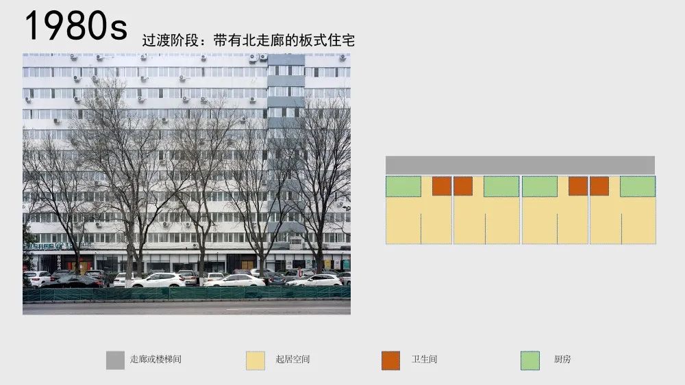 來到了80年代,也就是我後來去拍的這些樓,屬於計劃經濟時代末期的產物,我稱為板樓2.0,也是看起來最大最“板正”的一代,它們的標準平面大概是這樣的:通常兩端有南北通透的較大户型,中間是通長的北走廊,有的封閉有的開敞,然後中間的户型的入户門和朝北的窗子就對着公共走廊開。這個時期的大板樓是一個從集體主義生活到住宅商品化之間的一個過渡產物。