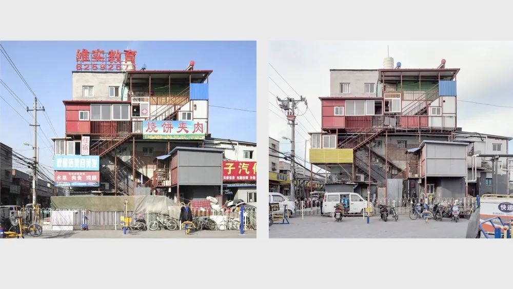 右邊這個房子是最開始説到的村口那個房子,左邊是它整治以前的,大家可以看到,原來這些盒子不光能住人,它還可以做燒餅夾肉、美容美髮、小孩教育、開超市等等,整個是一個城鄉結合部的商業綜合體。