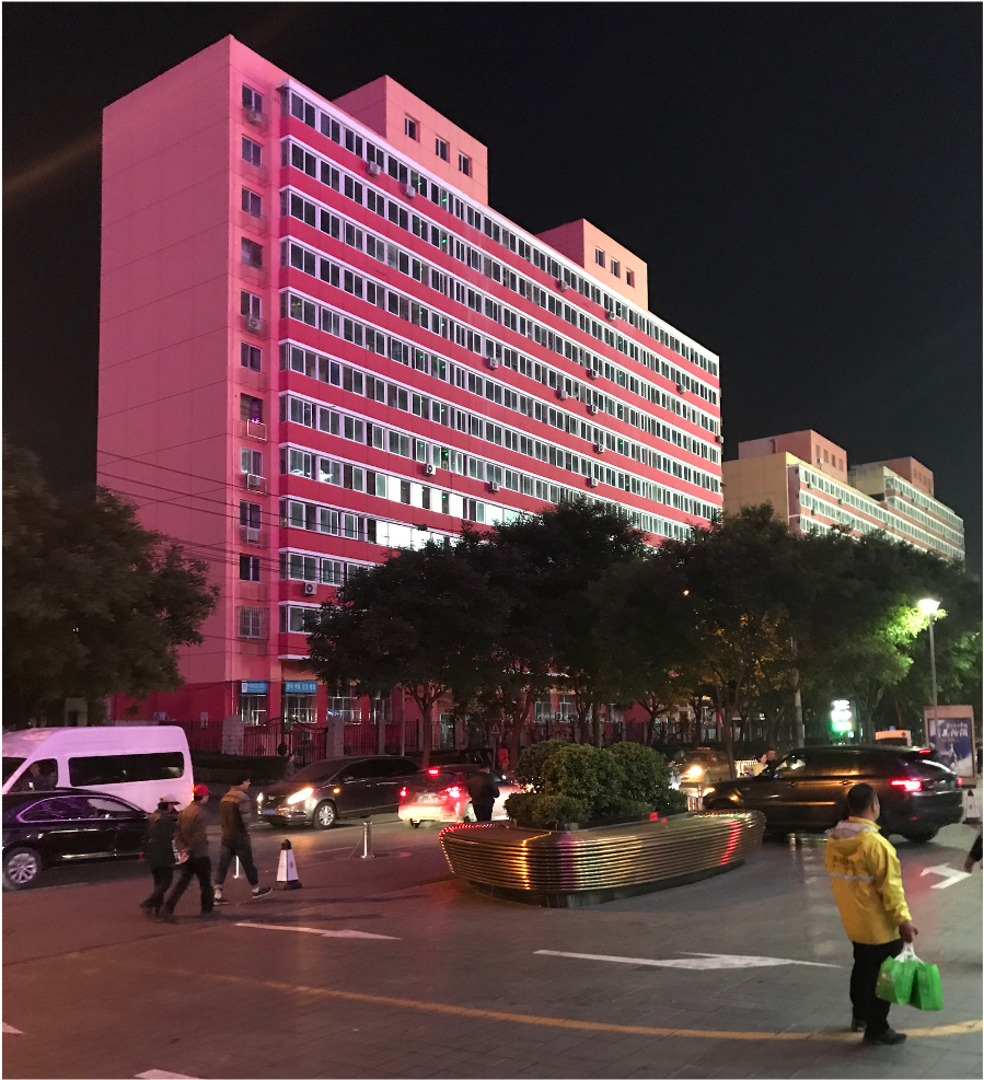 我真正注意到大板樓是有一天晚上去逛街,就看到照片裏的這棟樓了,方頭方腦的,本身形態沒有什麼吸引我的地方,但是被旁邊一個寫字樓的霓虹燈一照,反射出一種妖嬈的粉紫色的光,特別魔幻。