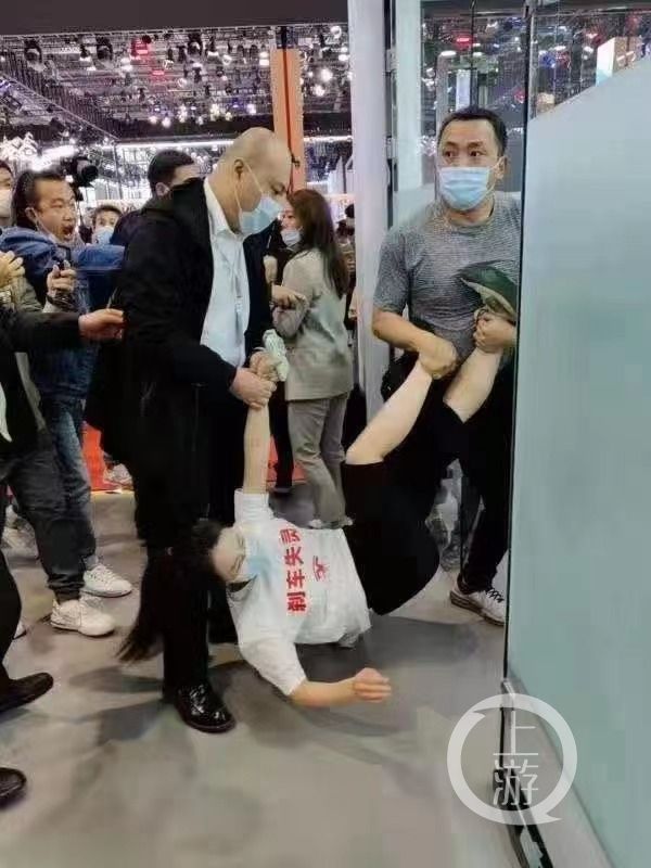 ▲4月19日,上海車展,特斯拉維權女被抬走。圖片來源/網絡