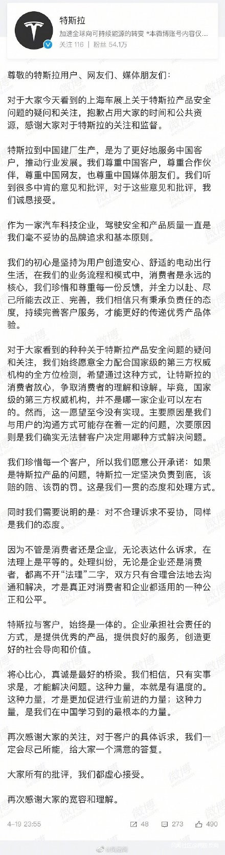新華社每日電訊評車主維權:誰給了特斯拉“不妥協”的底氣_風聞 两极反向-为了中国更强大,贪官买办公知精美一起骂2021-04-20 09:13 2021-04-20 https://ishare.ifeng.com/c/s/85aY1MH2pO2 19日,在上海車展特斯拉展位現場,一名女車主身穿“剎車失靈”字樣T恤站在車頂維權,引發關注。隨後,該公司一名高管回應稱“沒有辦法妥協,這是新產品發展必經的一個過程”,還強調“自己的調研顯示,90%的客户都願意再次選擇特斯拉”。特斯拉高管如此傲慢的回應,幾乎讓人感受不到解決問題的誠意。 不得不説,這是一起比較複雜的維權事件。目前雙方各執一詞:車主聲稱自己買的特斯拉存在“剎車失靈”問題,還曾坐在車頂拿大喇叭維權被報道;特斯拉則回應稱該車主“曾因超速違章發生碰撞事故,而後以產品質量為由堅持要求退車”。事實真相如何,很難倉促定論,有待相關部門深入調查之後能定分止爭。 從網絡輿情來看,特斯拉高管的傲慢回應,讓很多人感到費解。尤其“近期的負面都是她貢獻的”“我覺得她也很專業,背後應該是有人的”等表述也不太妥當。客觀來説,一家企業不可能讓所有人都滿意,但是作為一家“明星”企業,應該具備讓消費者滿意的產品和服務態度。 誠然,極端維權方式不值得鼓勵,但正如一些網民所説:如果消費者能順暢維權,誰會冒險站在車頂維權?當然,無論是涉事企業還是消費者,都要在法治框架內表達訴求,既不能鼓勵維權者“一鬧就靈”,也不該讓人覺得企業方“店大欺客”。如果車企不能提供質量過硬的產品和良好的售後服務,不能保障消費者安全行駛,甚至惡意猜測維權者的動機,可能會砸了自己的招牌。 中國是全球最大的汽車產銷市場之一,也是全球知名車企爭奪的重要市場。無論哪家車企,都須對中國市場有敬畏之心,誠懇接受消費者監督。對消費者反映的問題,車企應建立暢通的投訴處理渠道,不能讓客服電話總處於佔線狀態,或是“態度很好,就是不辦”——否則,長此以往,相關車企很可能被市場邊緣化。 此外,如果車企涉嫌“店大欺客”,有關部門也要加強監管。維護消費者權益,有很多法律法規和實施細則,但能否落實到位是關鍵所在。要讓消費者維權更高效、便捷,儘量避免各種維權鬧劇。這既能倒逼車企提高質量,也有助於維護消費者合法權益。