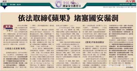 《大公報》也在“全民國家安全教育日”發表評論文章批評道,一些媒體仍然利用其所謂‘第四權’的身份,從事勾結外國勢力、‘煽暴造假’、挑戰國安的勾當。其中《蘋果日報》更扮演着最為惡劣、最為猖狂的角色。