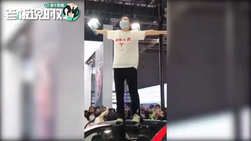 然而,在特斯拉汽車的展台上,卻突然出現了一名身着白T的女士,站上車頂,在現場大聲表達自己的不滿。