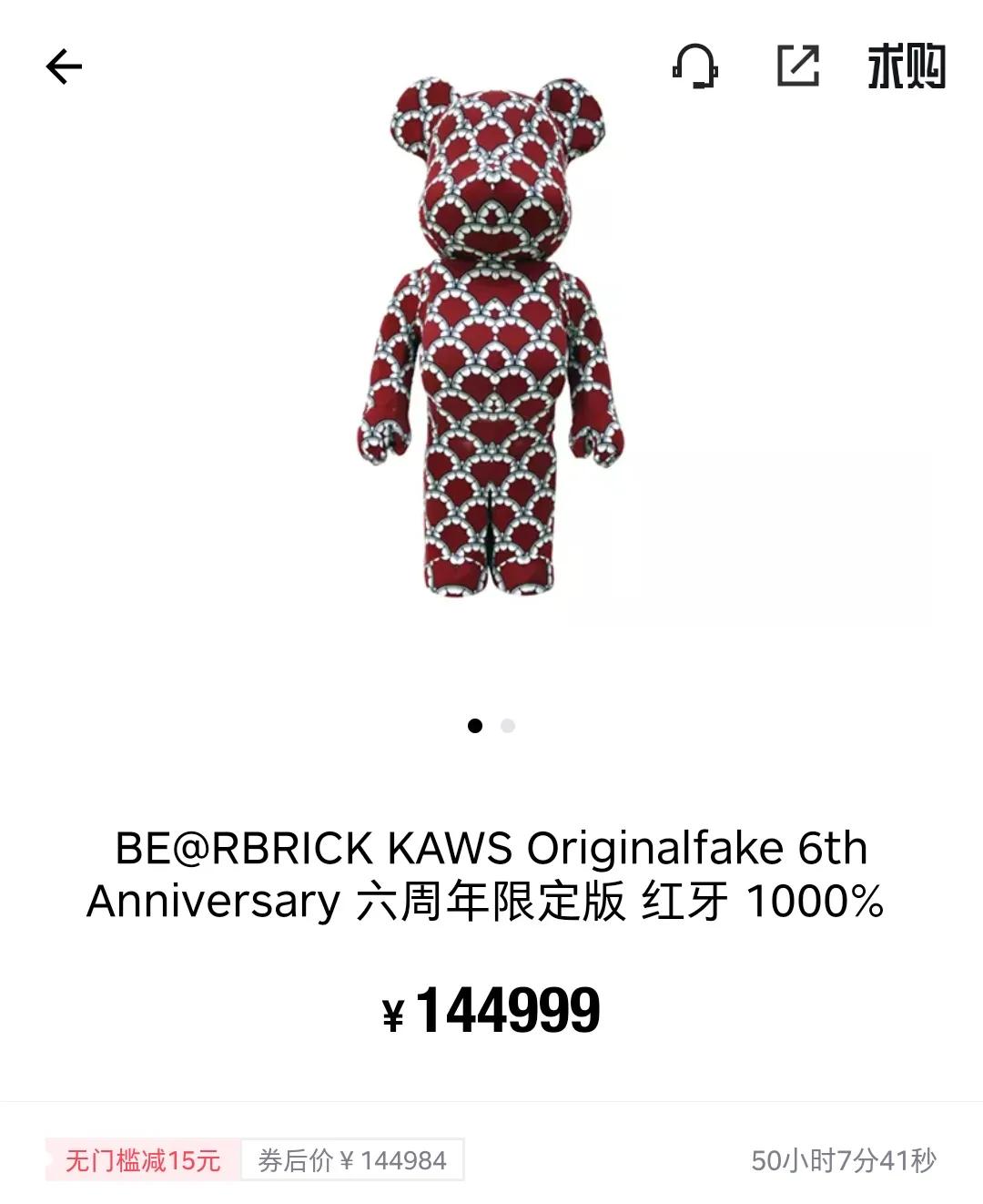 4月15日,某潮物平台上價格最高的積木熊是2012年限量款“紅牙”,尺寸規格1000%,價格接近14.5萬元。當然,其他尺寸的限量款積木熊也有備受青睞的。