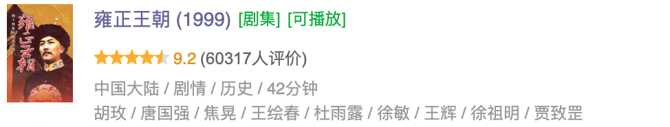 是《雍正王朝》開清宮戲先河,創“九子奪嫡”戲碼之範本,後來者如《宮》《步步驚心》…..乃至《甄嬛傳》都套用了它的殼。