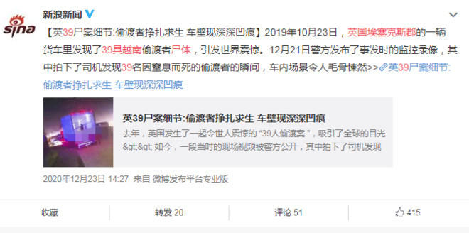 2019年10月23日凌晨,英國埃塞克斯郡一個工業園裏,一輛貨車的冷凍貨櫃內,驚現39具亞裔面孔的屍體。