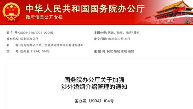 早在1994年,國務院辦公廳就在《國務院辦公廳關於加強涉外婚姻介紹管理的通知》中明令禁止成立涉外婚姻介紹機構,所有介紹越南新娘的中介行為,均為非法。