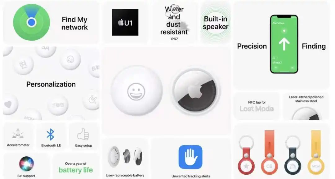 另一項頗受期待的產品“防丟追蹤器”AirTag,這一次終於千呼萬喚始出來,支持自定義鐫刻emoji,支持小配件,用户可以將它綁在揹包或其他物品上,通過iPhone快速找到。