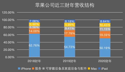 在蘋果近三財年的營收佔比中,iPad在其整體五大業務(iPhone、服務、可穿戴設備及家庭設備與配件、Mac、iPad)的佔比排位明顯下降,從2018年的第四大業務,到2020年已被可穿戴、家庭設備及配件業務超過,是蘋果五大業務佔比最小的業務,僅佔比8.64%。