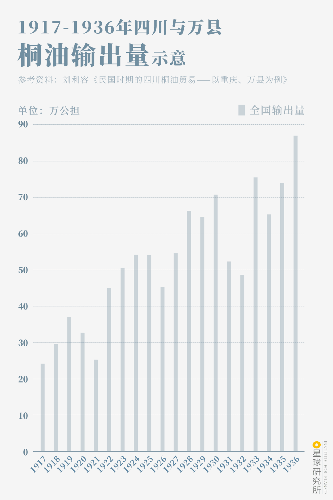 1917-1936年四川與萬縣桐油輸出量示意圖 | 製圖@楊寧/星球研究所