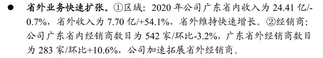 ②經銷商:公司廣東省內經銷商數目為542家/環比-3.2%,廣東省外經銷商數目為283家/環比+10.6%,公司加速拓展省外經銷商。”