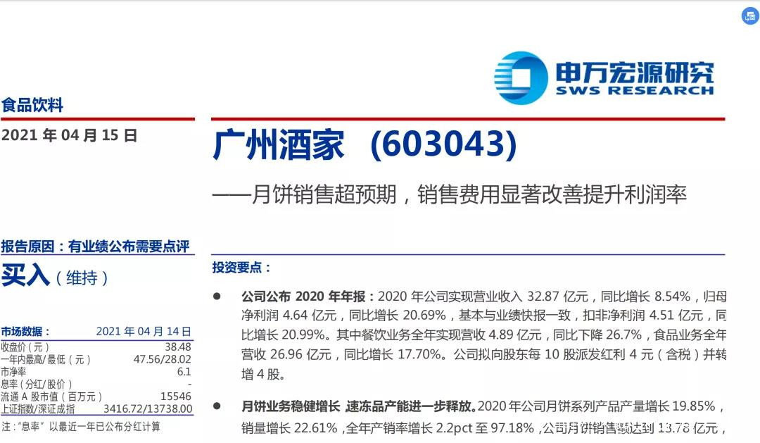 申萬宏源則表示,廣州酒家的業績增長與食品業務,尤其是月餅的增長密切相關。