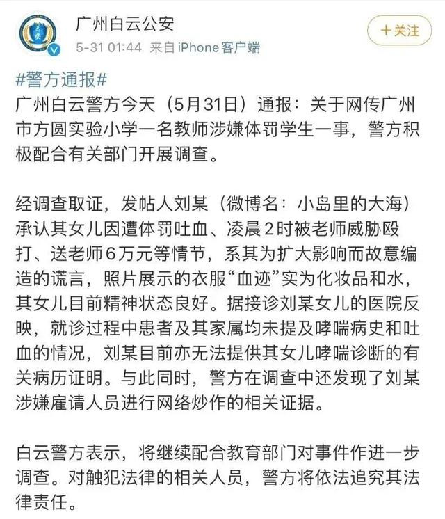 經調查,網民“小島裏的大海”承認“體罰吐血、威脅毆打、送禮6萬元”等情節確係其編造 ,她同時還僱傭了“網絡水軍” 增加轉發、點贊數量。對此,廣州白雲公安第一時間固定證據併發布警方通報予以澄清。