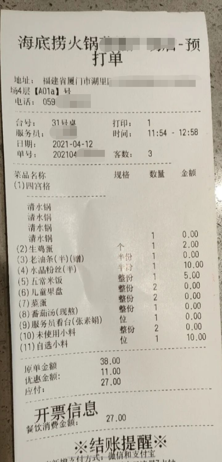 事情是這樣的,一位小紅書博主帶着兩個孩子去廈門吃海底撈,聲稱跟風模仿網上流傳的“17塊錢吃垮海底撈”的攻略,只點了四宮格的清湯鍋、一個雞蛋、一份米飯、一份水晶粉絲和一份自助小料,一大兩小總共花了27塊錢,其他的油條、番茄湯、兩份兒童果盤和蒸蛋都是送的,還做了美甲。