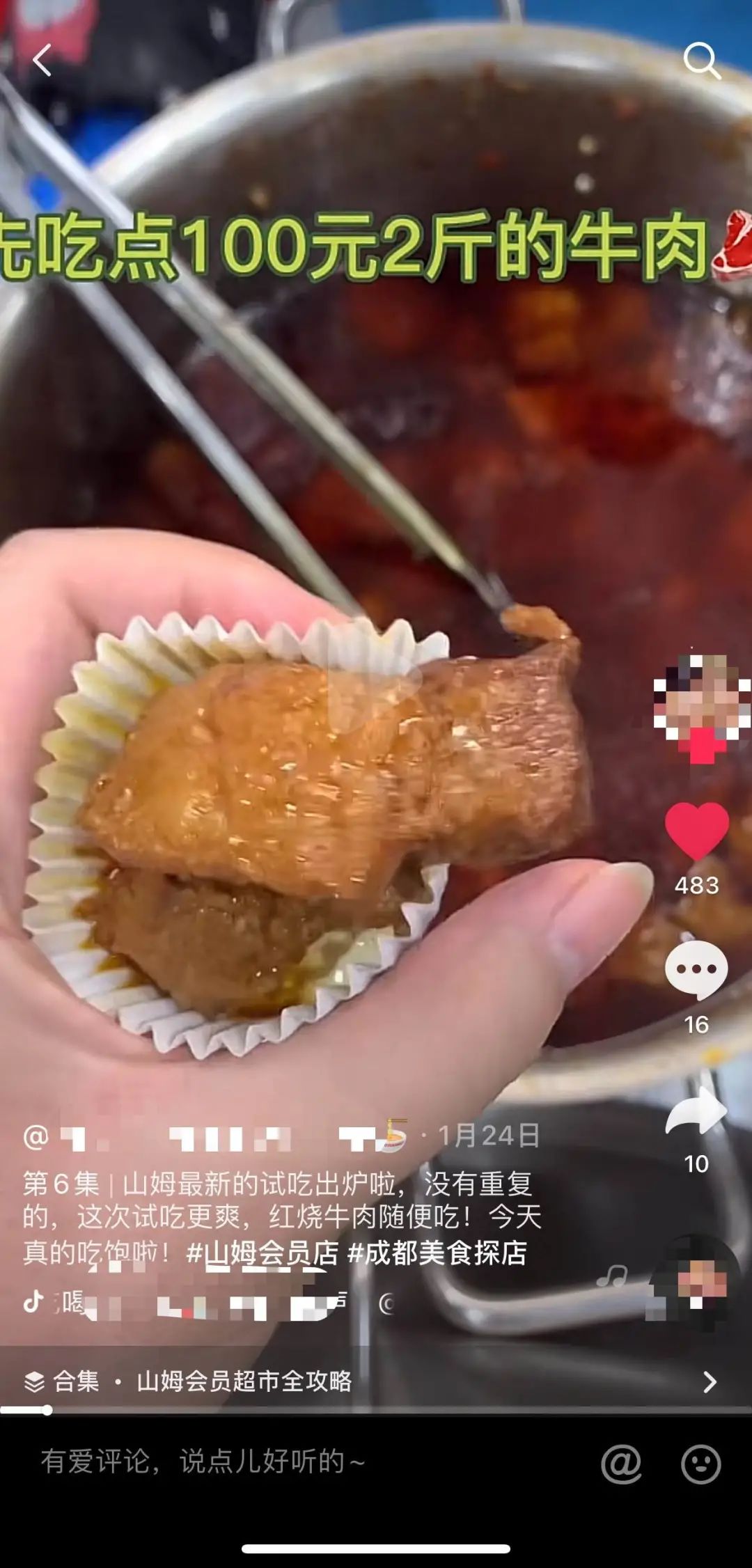 “挑戰山姆超市試吃到飽”,“一整天在山姆會員店無限量試吃,吃到扶牆出”是薅播博主的常見選題,他們在視頻中總結了試吃攻略、順序,以及試吃品的價格:先吃肉喝酒,100元2斤的牛肉、30元一片的西冷牛排下肚後,喝點羅曼蒂康妮解解膩,再吃涼菜、甜點和水果,包括60元2.5斤的豆腐絲、78元一斤的黃花菜、62元一斤的香菇、22元4斤的地瓜、70元3斤的巧克力、30元一斤的草莓、90元6斤的芒果、80元10斤的蘋果,吃飽了再喝點420元一斤的牛肝菌湯、110元7升的甜牛奶。