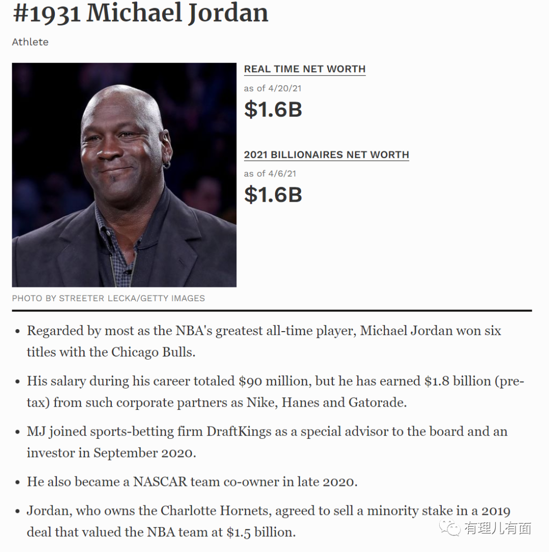 如今的喬丹是一名成功的商人,現任職夏洛特黃蜂董事長及主要股東。《福布斯》2021全球富豪排行榜上,喬丹以16億美元的身價排在第1931位。他走出了一條讓美國非裔人羣羨慕的模樣。