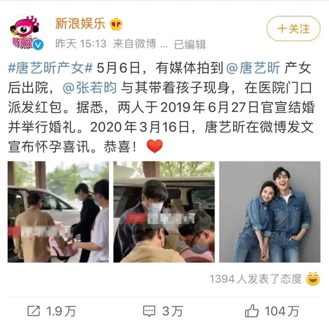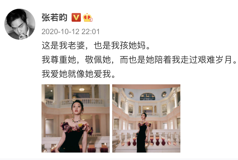 很快,唐藝昕產後修復結束,復出時,張若昀也迅速在微博表白。