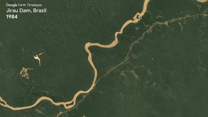 巴西西北部流域上建立着世界上最大的的川流式水力發電站傑瑞大壩(Jirau Dam),可以看到綠色越來越少。