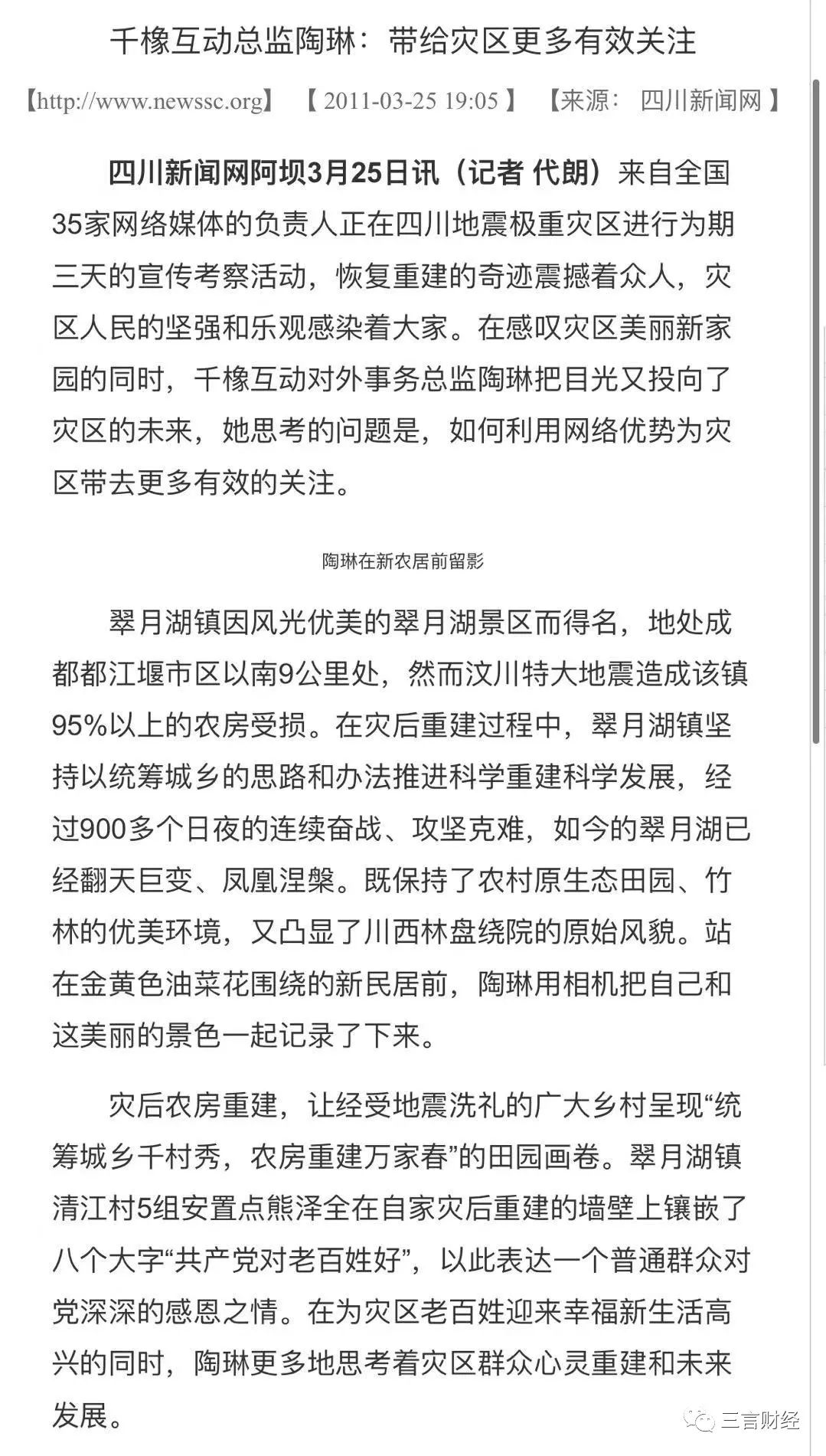 在2011年四川新聞網的一篇文章,陶琳是千橡互動(人人網)的對外事務總監,當時的千橡互動是作為35家網絡媒體的代表,來到四川地震災區進行宣傳考察活動。