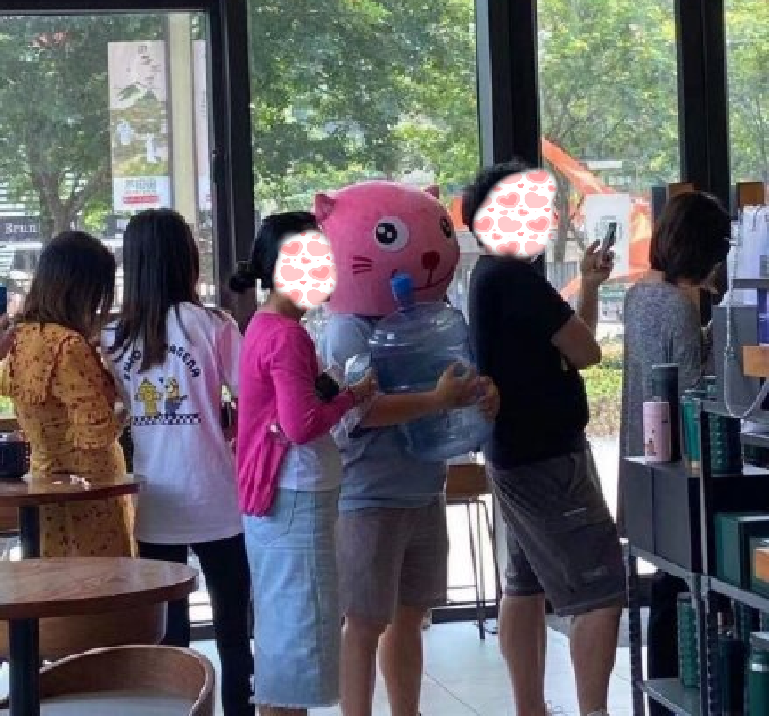 不過,很快就有網友發現,有人帶來了一個桶,為了防止被人認出甚至還戴上了玩偶頭套。
