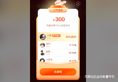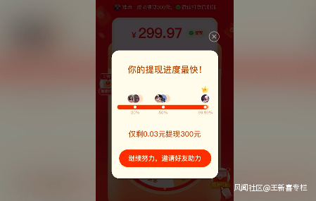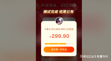 再是點擊提現時,提醒要先測試差多少錢可以提現。測試結果顯示為299.0元,僅差“0.10元”就能提現300元現金。(是的,之前顯示的300元似乎不作數了)