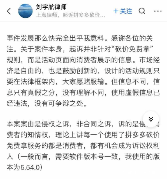 就是這麼魔幻。此前因邀請多位好友砍價但始終差“0.09%”才可免費拿,而起訴拼多多的劉宇航律師,也大抵經歷這般“折磨”。