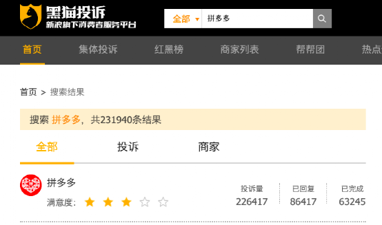 而從黑貓投訴等網絡投訴渠道,也能看出拼多多的投訴之甚。當筆者打開黑貓投訴搜索關鍵詞“拼多多”時,顯示相關投訴量為226417,已回覆為86417。未回覆的投訴剛好為14萬。