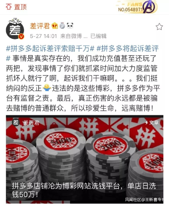 自媒體“差評”發佈一篇名為《拼多多店鋪淪為博彩網站洗錢平台,單店日洗錢50萬!》的文章,內容直指拼多多涉嫌博彩洗錢類違法交易。且表示“事情是真實存在的,我們成功充值甚至還玩了兩把。”