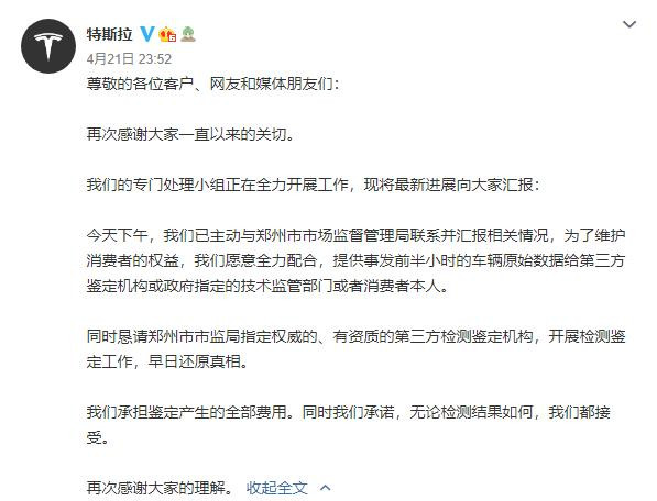 4月21日深夜11點52分,特斯拉官方微博發佈最新聲明,對於維權車主張女士此前多次提出的訴求,即讓特斯拉方面提供事發前半小時車輛原始數據一事,給予了回應。