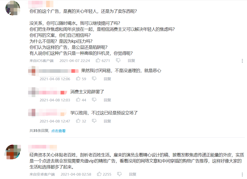 在B站或是微博上,除去一些網友面對易式審問的瑟瑟發抖,不滿她接廣告的評論也被頂到高位。甚至有網友説,大眾喜歡她,是因為她能犀利戳穿造星文化割韭菜的本質,現在接廣告卻變成了和娛樂明星一起割韭菜的人。