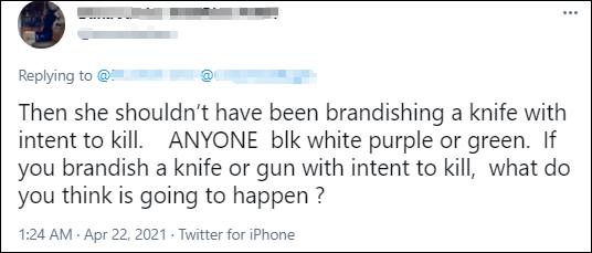 “她就不該揮舞着刀想殺人。任何人,無論膚色是黑色、白色,甚至是紫色或綠色,如果你揮舞着刀或槍意圖殺人,你認為會發生什麼?”