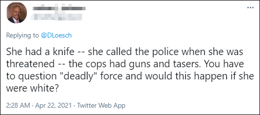“她有一把刀…但警察有槍和泰瑟電擊槍,你必須質疑這一‘致命’武力(的使用是否合理),以及如果她是白人,這會發生嗎?”