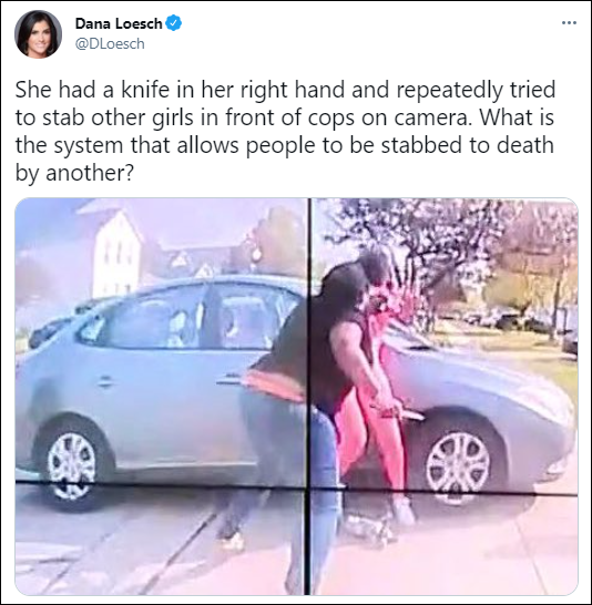 在21日的一條推文中,洛斯寫道:“她(布萊恩特)右手拿着一把刀,視頻顯示她多次試圖刺傷其他女孩,是什麼制度允許人們被別人捅死?”
