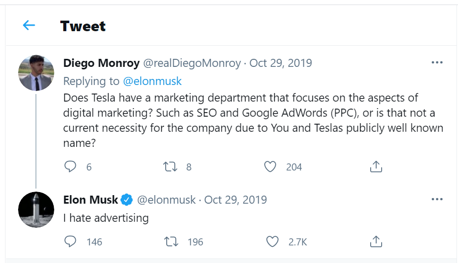 一個證據是,2019年,有人在推特上詢問馬斯克是否設有專注於數字營銷方面的營銷部門?馬斯克的回覆是:我恨廣告。