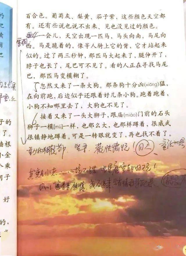 課文對這段精彩的描寫也動了“手術”,把“五秒鐘之內”改成“一會兒”,在前段已經出現了一組排比結構“一會……”的前提下,再用“一會兒”就顯得語義重複、語言單調了。並且,時間概念也較“五秒鐘之內”模糊,不足以強調火燒雲變化之快。課文把“再過一秒鐘,沒有什麼變化”刪掉了,這相當於把一個時間的鏈條掐斷,後面的“再過兩三秒鐘”就沒了依託。原文該段末句有四個“馬”字,課文只保留第一個,而把後三個都刪掉了,這個“化簡”似乎合理:這在語法上叫做“承前省略”。然而,簡則簡矣,韻味就寡淡了。編者應該懂得,文科不同於理科,文學不同於數學,請不要“合併同類項”。除了簡化,編者還應照顧到兒童的語言特徵及語境等因素。