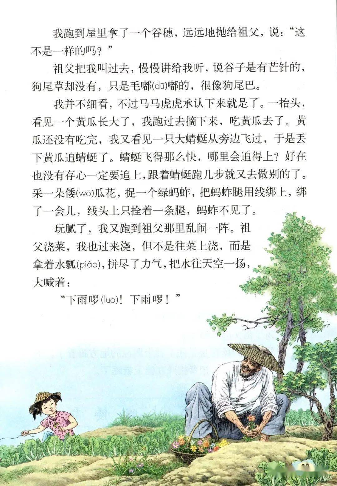 課文將其中的“摘”字改成“拔”,這又不準確了。因為把草“拔”下來,往往讓人感覺是“連根拔起”的意思,而祖父為了給“我”示意狗尾草與穀子的區別,僅僅是把狗尾草的“穗”抽出來,所以用“摘”字是妥帖的。這麼充滿靈性的詞,竟被編者蠻橫地“拔”掉了!