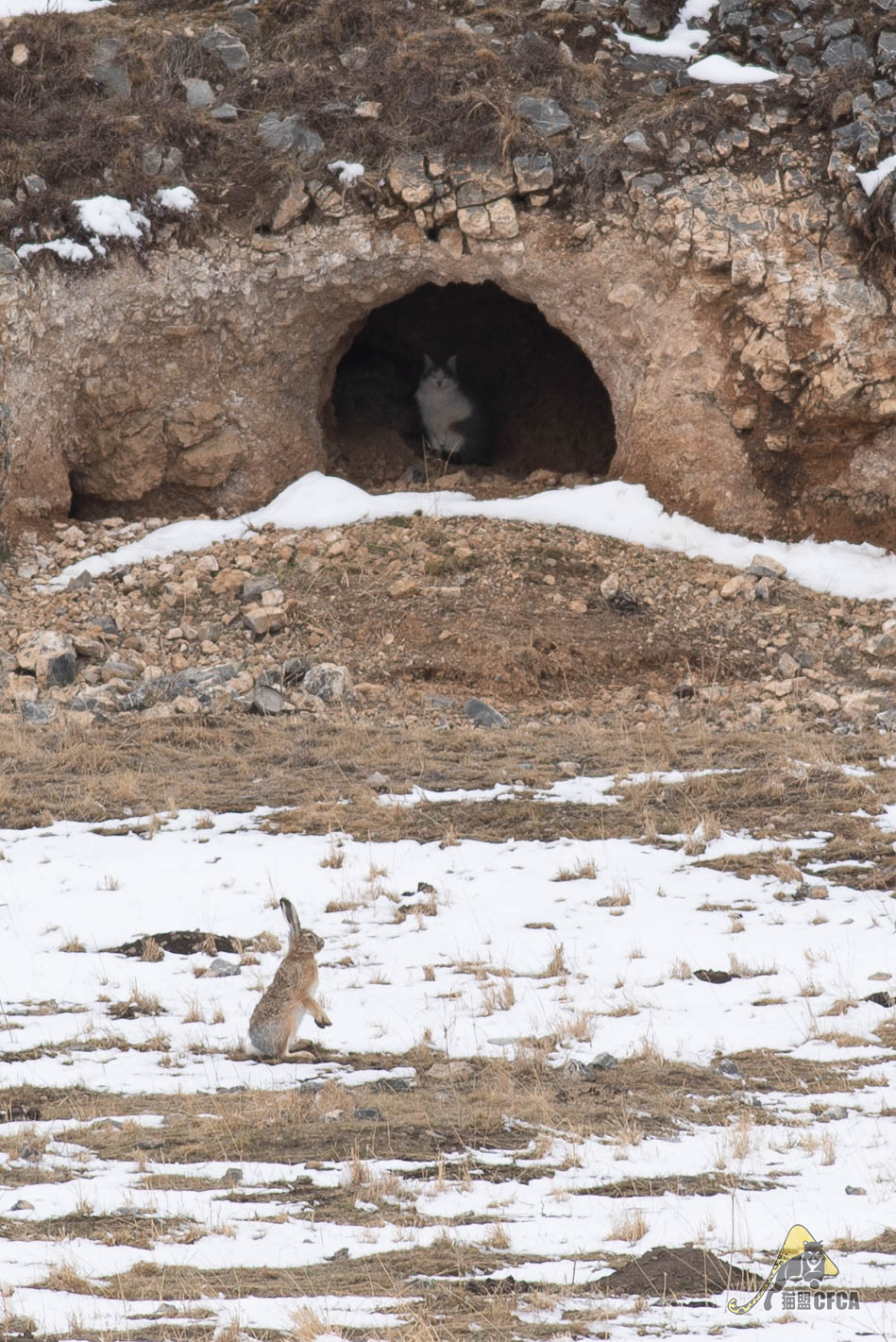 離若爾蓋縣城不遠處的路邊洞穴裏,一隻家貓正暗中觀察着外面似乎毫不知情的高原兔。