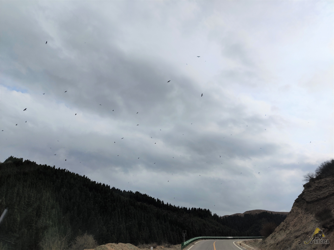 當我們拐過這道不知名的山隘(可能叫做“達交弄”)時,山的輪廓與天交接處的大片空白彷彿忽然被風捲起了碎葉般,充盈着飛舞的黑色斑點。