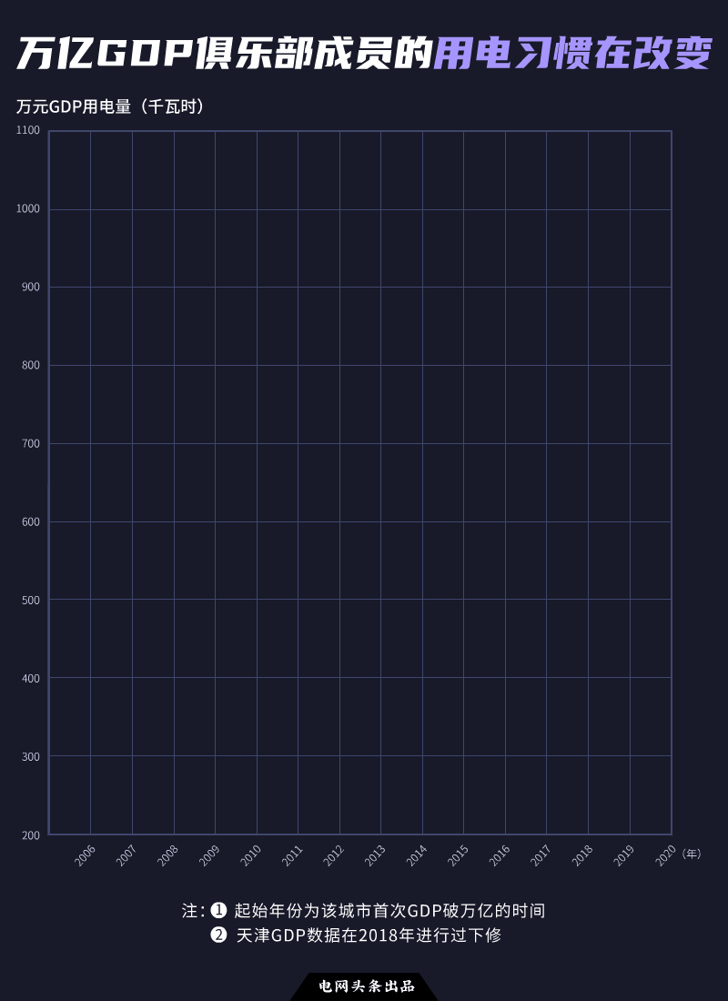 不過,總體來看,得益於第三產業高速發展以及各地製造業結構的持續優化,高耗能產業佔比降低、高端製造業佔比逐步提升等,大多數萬億GDP城市單位GDP用電量都呈下降趨勢。