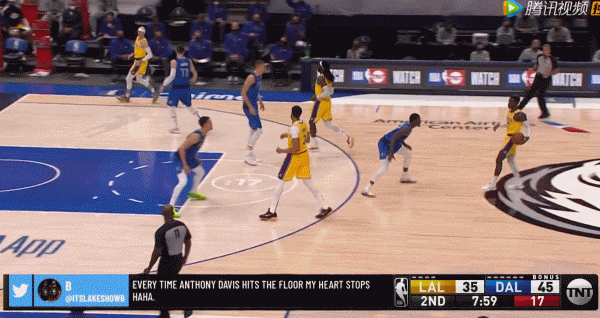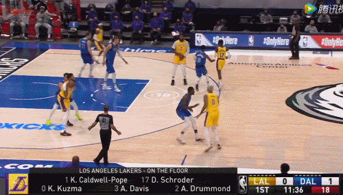 **和德拉蒙德在一起防守時,兩人也缺乏合作默契。**在戴維斯和詹姆斯缺陣期間,德拉蒙德入隊,他的防守還是相當賣力,經常會跟到三分線外,腳下並不偷懶。可是,德拉蒙德畢竟腳下慢,漏人也是常有的事,按“雙塔”的要求,戴維斯這時候是最後一道關,但他仍然讓盧卡殺進來,傳出漂亮的空接。